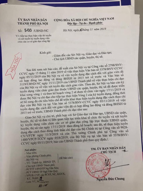 Theo đó, tại công văn hỏa tốc số 5119 gửi Giám đốc Sở Nội vụ, Sở GD & ĐT, chủ tịch UBND các quận, huyện, thị xã do chủ tịch UBND TP Hà Nội Nguyễn Đức Chung đã ký về việc thực hiện chỉ đạo của Bộ Nội vụ về tuyển dụng đặc cách với giáo viên đã có hợp đồng lao động và đóng bảo hiểm xã hội từ 2015 trở về trước.