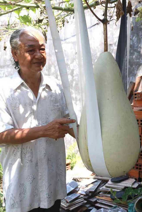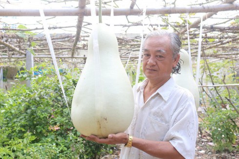Ông Huỳnh Tài (60 tuổi; ngụ đường Trần Nguyên Hãn, phường Châu Văn Liêm, quận Ô Môn, TP Cần Thơ) là người sở hữu giống bầu nói trên. Nhà ông Tài có vườn phía sau khá rộng, khoảng 300 m2, được ông tận dụng trồng bầu, mướp.
