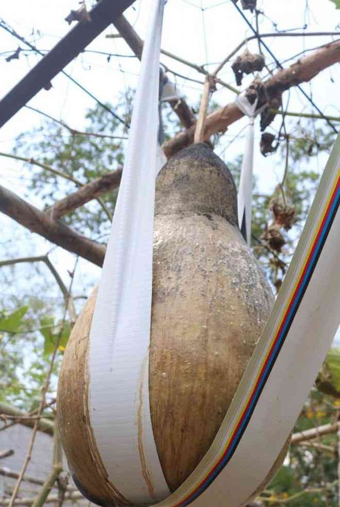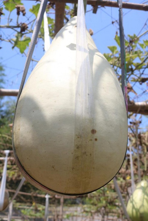 Do quá to và nặng nên những trái bầu cần phải có dây buộc lại |