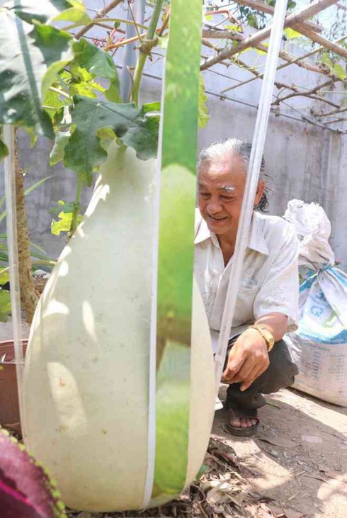 Ông Tài lấy giống trái to để gieo trồng cho vụ thứ 2. Sau 2 tháng trồng, bầu bắt đầu cho trái non và lớn nhanh như thổi khiến ông Tài cùng những người trong gia đình rất bất ngờ. Trung bình trái bầu nặng từ 15-17 kg, nếu để lâu hơn thì bầu có thể đạt trọng lượng đến 30 kg.
