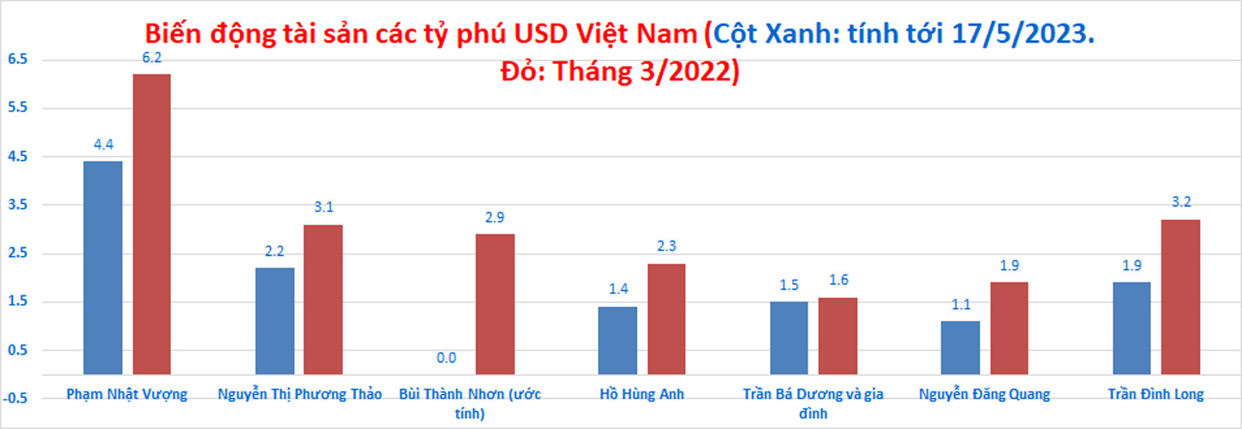 Theo danh sách tỷ phú USD thế giới năm 2023 do Tạp chí Forbes (Mỹ) hồi đầu tháng 4/2023, Việt Nam có 6 đại diện. Các tỷ phú Việt Nam có khối tài sản trị giá 12,6 tỷ USD, "bốc hơi" 8,6 tỷ USD so với năm 2022. Tuy nhiên, tài sản của gia đình Chủ tịch Thaco Trần Bá Dương không thay đổi, ở mức 1,5 tỷ USD.