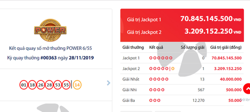 Tại kỳ quay số mở thưởng thứ 363 loại hình xổ số Power 6/55 diễn ra tối 28/11, Công ty Xổ số điện toán Việt Nam (Vietlott) đã bất ngờ tìm ra chiếc vé của những người chơi may mắn trúng giải Jackpot 2, trị giá 3.209.152.250 đồng.