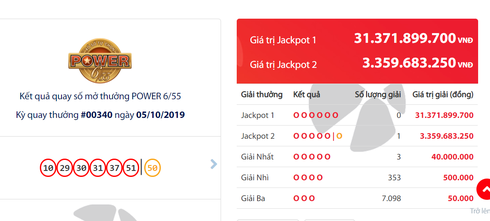 Tại kỳ quay số mở thưởng thứ 340 loại hình xổ số Power 6/55 diễn ra tối 5/10, Công ty Xổ số điện toán Việt Nam (Vietlott) đã tìm ra được 1 chiếc vé của người chơi may mắn có các số trùng khớp với giải Jackpot 2, trị giá 3.359.683.250 đồng.