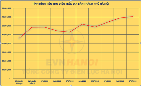 Theo số liệu thống kê của Tổng công ty Điện lực thành phố Hà Nội (EVN HANOI), sản lượng điện tiêu thụ toàn thành phố đã đạt 70,47 triệu kWh vào ngày 08/6/2018, sản lượng điện tiêu thụ ngày bình quân lũy kế tháng 6 (tính đến ngày 08/06/2018) là 61,12 triệu kWh, đây là mức tiêu thụ điện cao kỷ lục từ đầu năm đến nay.