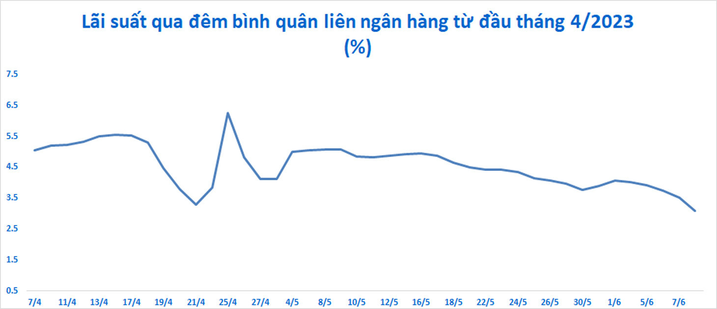 Trên thị trường liên ngân hàng, lãi suất cho vay qua đêm giảm mạnh, từ mức gần 6,3% hồi cuối tháng 4 xuống mức 3-,35%/năm như hiện tại và thấp hơn rất nhiều mức đỉnh 8,44% ghi nhận hồi đầu tháng 10/2022.