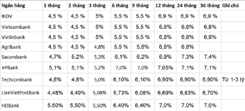 Dưới đây là tổng hợp biểu lãi suất huy động ở một số ngân hàng hiện nay: