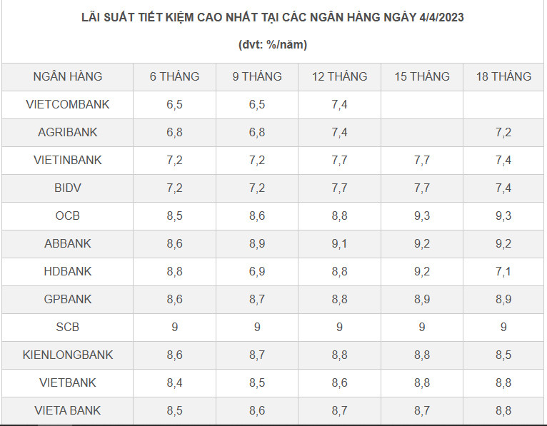 Đối với nhóm các ngân hàng thương mại cổ phần, lãi suất huy động cao nhất đang thuộc về những ngân hàng có lãi suất từ 9% trở lên như: OCB lãi suất 9,3%/năm đối với kỳ hạn 13 tháng trở lên; SCB lãi suất 9%/năm với tất cả các kỳ hạn tiền gửi từ 6 tháng trở lên; ABBank có lãi suất 9,1% đến 9,2%/năm với các kỳ hạn từ 12 tháng trở lên.