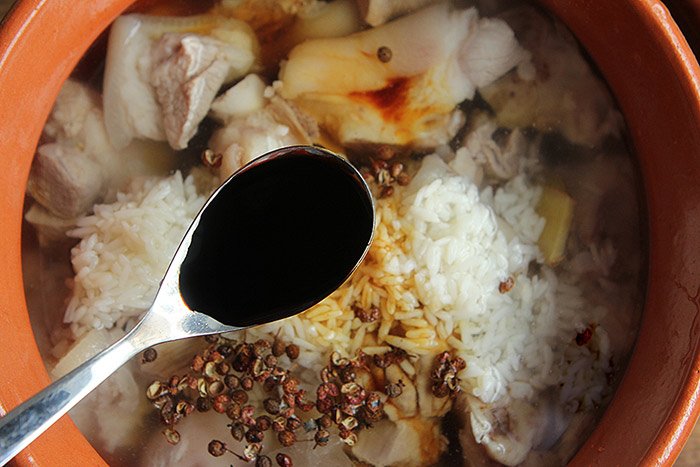 - Đổ chân giò đã chần vào nồi đất, cho nước vào, nước chưa ngập đến mặt chân giò, thêm đường phèn, tiêu và gừng thái lát vào.