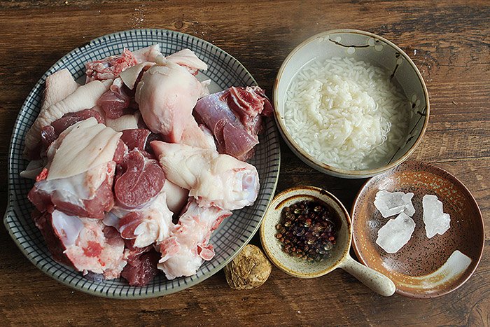 - 1 cái chân giò, nửa bát con cơm rượu, 4 viên đường phèn, 1 thìa hạt tiêu, gừng lượng vừa đủ, 4 thìa nước tương, 1 thìa hắc xì dầu, 1/2 thìa cà phê muối