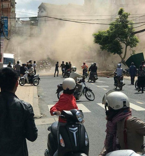 Tại hiện trường, toàn bộ tầng 2 của ngôi nhà đang tháo dỡ sập xuống, bụi bay mù mịt cả một đoạn trên đường Phan Đình Phùng.