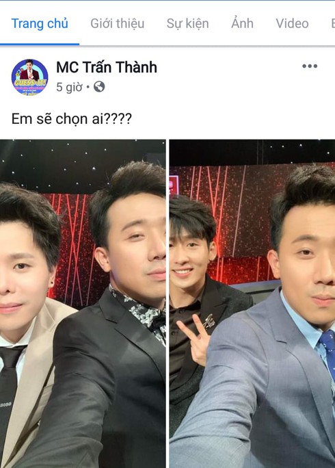 Dù luôn bị chê là đuông dừa vì cơ thể “phát phì” của mình nhưng Trấn Thành vẫn không ngần ngại đọ sắc với các nam thần của V-Biz như Trịnh Thăng Bình, Tuấn Trần. Anh chia sẻ dòng trạng thái “Em sẽ chọn ai?".Tuy kém sắc hơn hai nam ca sĩ điển trai kia nhưng khả năng ăn nói, hài hước, duyên dáng của anh Xìn đã khiến hầu hết các fans vote "chọn Trấn Thành". |