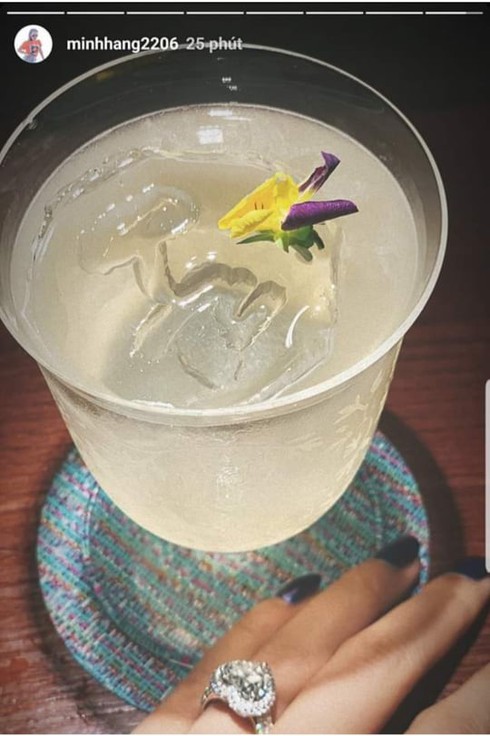 Trên trang cá nhân của mình, Minh Hằng chia sẻ hình ảnh cốc nước tiện thể khoe khéo chiếc nhẫn kim cương hình trái tim đeo ở ngón áp út úp mở việc đang trong một mối quan hệ yêu đương. Fans nhanh chóng nhận ra ý đồ “khoe của” cô nàng liền trêu chọc “Cốc nước đắt nhất từng được thấy”, “Uống nước thì uống nước luôn đi còn thập thò cái nhẫn”, “Chị có cần khoe vậy không, đẹp quá đi”. |