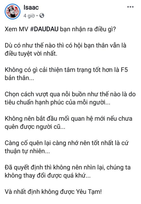 Nguyên văn dòng trạng thái của Isaac “Xem MV #DAUDAU bạn nhận ra điều gì?Dù có như thế nào thì có hội bạn thân vẫn là điều tuyệt vời nhất.Không có gì cải thiện tâm trạng tốt hơn là F5 (làm mới) bản thân.Chọn cách vượt qua nỗi buồn như thế nào là do tiêu chuẩn hạnh phúc của mỗi người.Không nên bắt đầu mối quan hệ mới nếu chưa quên được người cũ. Càng cố quên lại càng nhớ nên tốt nhất là cứ thuận tự nhiên.Đã quyết định thì không nên nhìn lại, chúng ta không thay đổi được quá khứ.Và nhất định không được Yêu Tạm!" . |