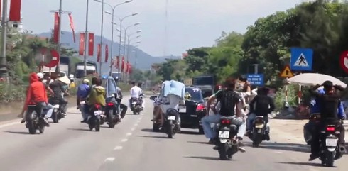 Trước đó vào khoảng 14h ngày 30/5, trong lúc rước dâu trên QL 1A, đoạn qua địa bàn xã Diễn Thịnh, huyện Diễn Châu (Nghệ An); nhiều xe máy đi xe kẹp 2, kẹp 3, không đội mũ bảo hiểm, dàn hàng ngang… khiến các phương tiện lưu thông phía sau không thể vượt lên mặc dù đã xin đường nhiều lần.