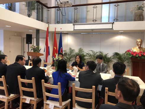 Đón tiếp đoàn tại trụ sở Đại sứ quán Việt Nam tại La Hay, Đại sứ Ngô Thị Hòa hoan nghênh tỉnh Vĩnh Phúc cử đoàn thăm Hà Lan và giới thiệu khái quát cho đoàn về hợp tác toàn diện giữa Việt Nam và Hà Lan trong thời gian qua. Lãnh đạo Tỉnh ủy và Ủy ban Nhân dân Tỉnh cũng thông tin cho Đại sứ quán các tiềm năng, thế mạnh và kế hoạch phát triển của tỉnh, qua đó, đề nghị Đại sứ quán hỗ trợ quảng bá thông tin về tỉnh Vĩnh Phúc, nhằm tăng cường thu hút đầu tư chất lượng cao, thiết lập thêm quan hệ đối tác kinh tế-thương mại, đặc biệt là trong lĩnh vực giáo dục, dịch vụ du lịch, nông nghiệp công nghệ cao, y tế và cơ khí v.v.