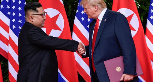 Lãnh đạo Kim Jong-un bắt tay Tổng thống Mỹ Donald Trump tại Singapore. |