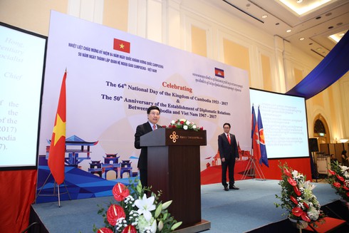 Phát biểu tại buổi chiêu đãi, thay mặt Đảng, Nhà nước và nhân dân Việt Nam, Phó Thủ tướng Chính phủ, Bộ trưởng Ngoại giao Phạm Bình Minh chúc mừng những thành tựu mà nhân dân Campuchia đã đạt được trong 64 năm qua, kể từ ngày giành được độc lập và chân thành chúc nhân dân Campuchia anh em sẽ tiếp tục giành được những thành tựu to lớn hơn nữa trong những năm tới.