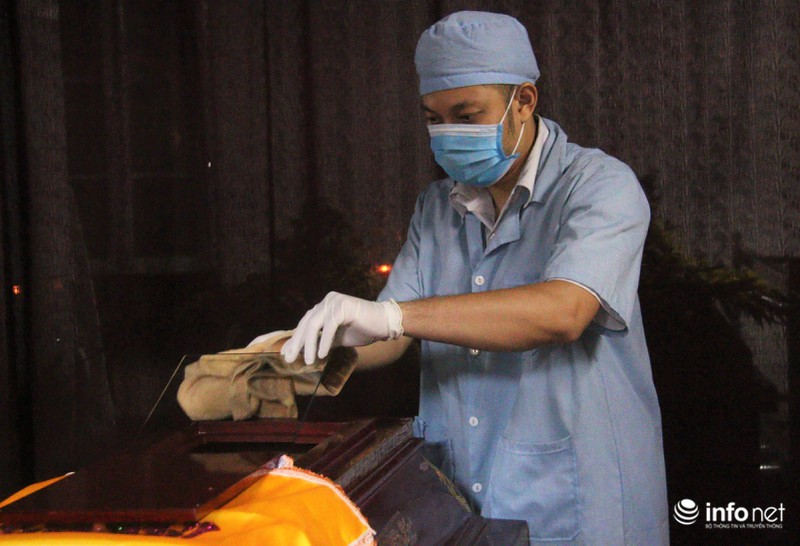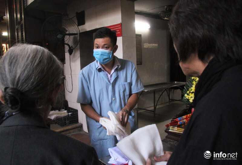 Khi bắt đầuđưa thi thể người mất từ phòng lạnh ra bên ngoài, các nhân viên ở đây phải đeo găng tay, khẩu trang bảo hộ đầy đủ. |