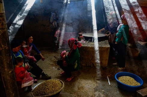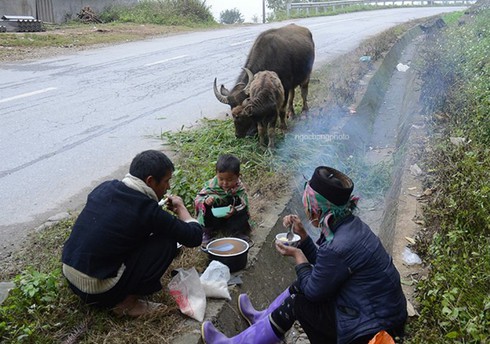 Một gia đình người Mông phải di chuyển trâu xuống vùng thấp để tránh rét. |