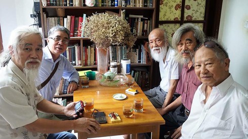 Tác giả Phạm Xuân Nguyên cùng với nhà giáo Phạm Toàn, nhà giáo Văn Như Cương và những người bạn trong một cuộc trà dư tửu hậu. (Ảnh: X.N) |