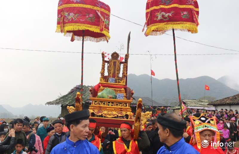 Nhóm nam thanh niên trai tráng trong làng kiệu Ngài từ đình làng Mỏ ra miếu Xa Vùn (thờ đức thánh Cao Sơn Quý Minh).