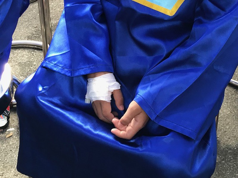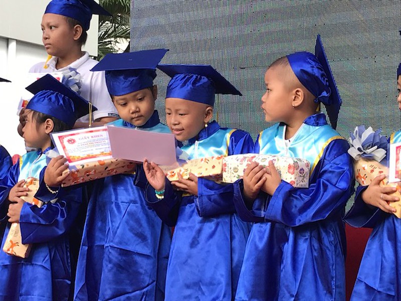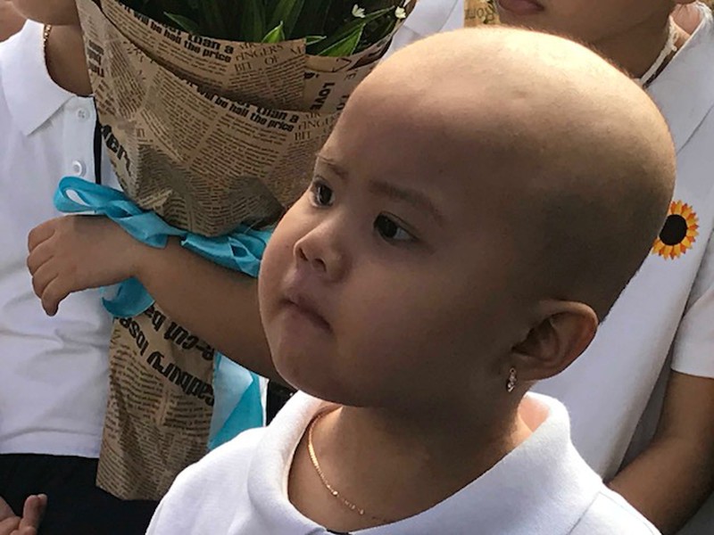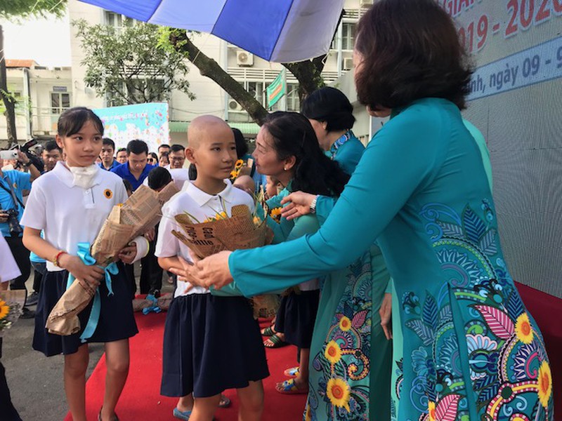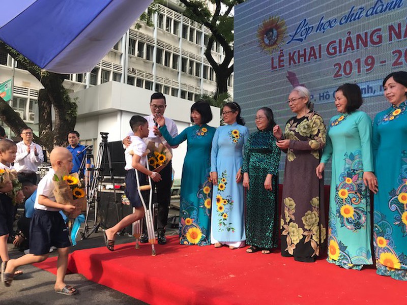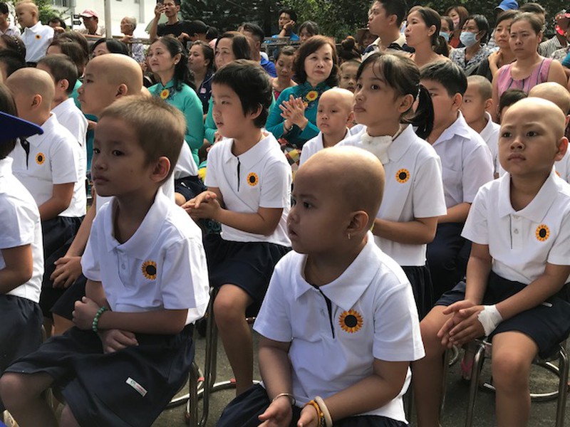 Sáng 9/9 tại sân của Bệnh viện Ung bướu TPHCM, những đứa trẻ đầu trọc lóc vì hóa trị, xạ trị xúng xính trong những bộ đồng phục mới có in hình bông hoa hướng dương rực rỡ để đón lễ khai giảng đầu tiên của mình.