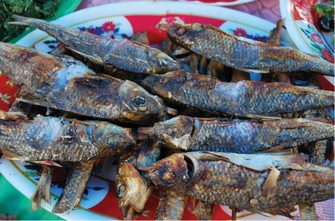 Cá “quẫy” mình rồi nằm im trong sức nóng của hơi than hồng và từ khối đá. Luôn tay trở đều từng con để cá chín đều vàng ươm và tươm mỡ tỏa mùi thơm nứt mũi. Một lát sau, cá đã được bày trên cái mâm dã chiến bằng lá môn rừng.