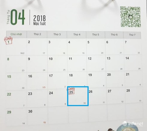 Theo lịch nghỉ các ngày lễ, tết trong năm 2018 mà Bộ Lao động – Thương binh và Xã hội đã công bố, tiếp sau kỳ nghỉ Tết Nguyên đán Mậu Tuất 2018 liền 7 ngày; công chức, viên chức và người lao động tiếp tục được nghỉ ngày giỗ Tổ Hùng Vương 10/3 âm lịch và ngày giải phóng miền Nam 30/4, Quốc tế lao động 1/5 dương lịch.