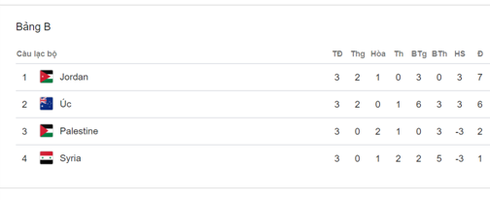 Như vậy, với kết quả này, Jordan và Australia là 2 đại diện của bảng B góp mặt ở vòng knock-out, còn Syria chính thức chia tay Asian Cup 2019 ngay từ vòng bảng.