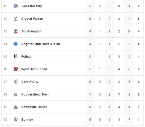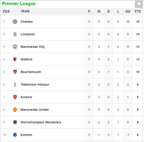 Lịch thi đấu, bảng xếp hạng trước vòng 6 Giải ngoại hạng Anh