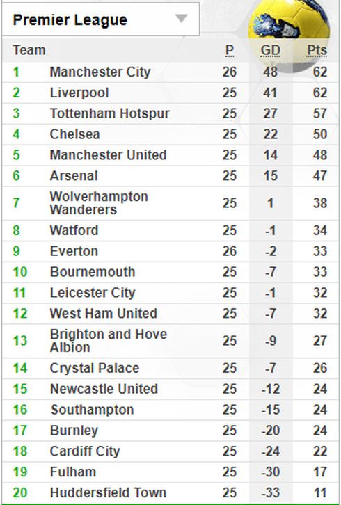 Bảng xếp hạng Premier League trước vòng 26. |
