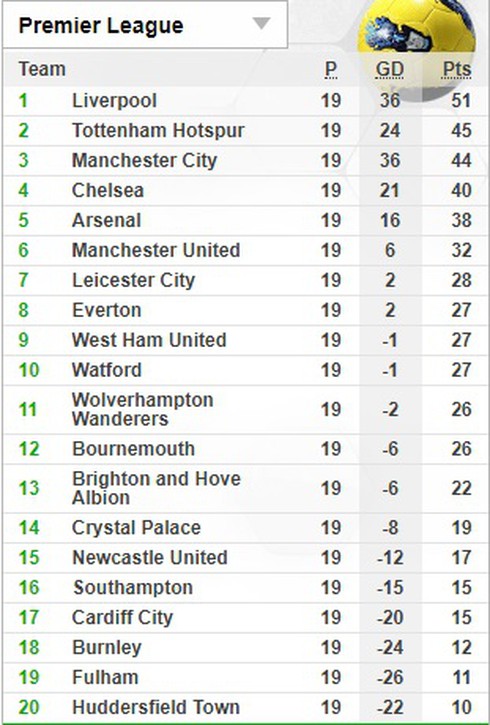Và đây là Bảng xếp hạng Ngoại hạng Anh trước vòng 20: