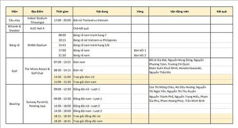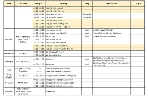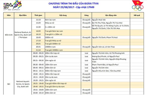 Lịch thi đấu SEA Games 29 đoàn thể thao Việt Nam ngày 25/8