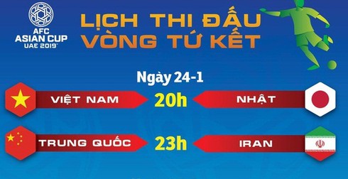 Tại vòng tứ kết Asian 2019, trận Việt Nam vs Nhật Bản là cặp đấu đầu tiên của vòng tứ kết Asian Cup 2019, diễn ra vào lúc 20h ngày 24/1 tới.