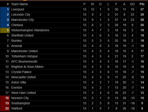 Bảng xếp hạng Premier League trước vòng 14. |
