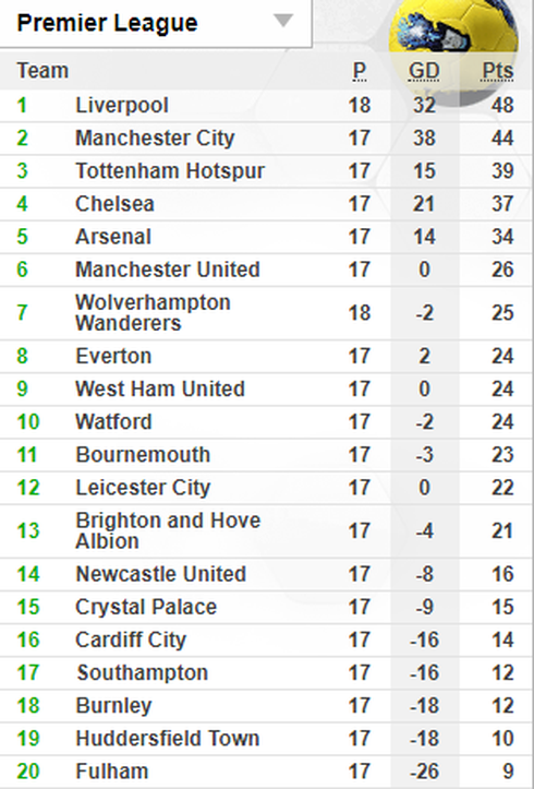 Bảng xếp hạng trước vòng 18 Premier League. |