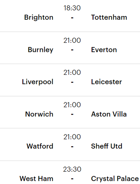 Trận đấu giữa Liverpool và Leicester sẽ diễn ra lúc 21h tối nay, thứ Bảy, ngày 05/10. Trong khi đó, các đội bóng lớn còn lại đều ra sân vào tối Chủ nhật.