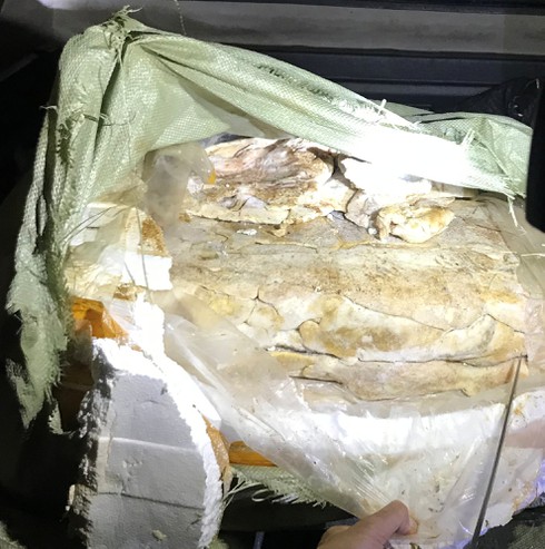 8 bao tải dứa có chứa sản phẩm động vật là nầm lợn đã được cấp đông, tổng trọng lượng là 400kg, trị giá lô hàng ước khoảng 40 triệu đồng. Khi tiếp xúc với môi trường bình thường, một số bị chảy nước màu đen, bốc mùi hôi thối khó chịu, không đảm bảo điều kiện vệ sinh thú y.