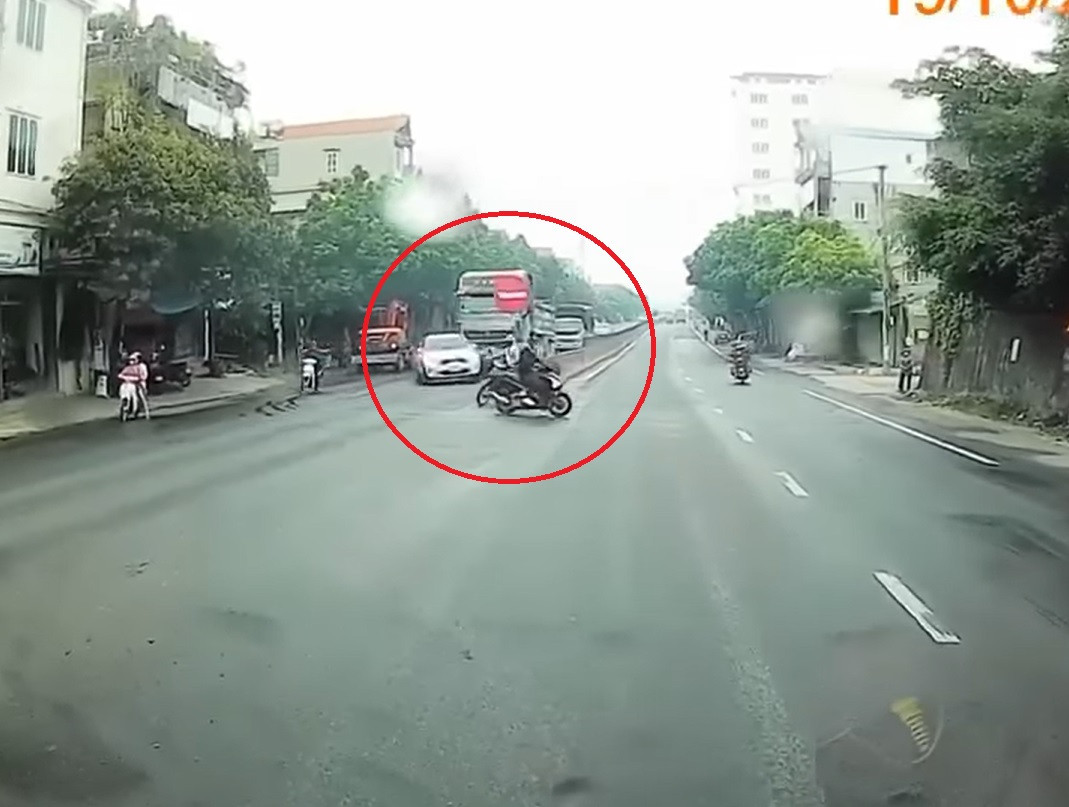 Đến 9h22' sáng nay, 20/10 lại tiếp tục thêm 1 clip ghi lại hình ảnh vụ tại nạn với tình huống tương tự xảy ra trên đường. Một chiếc xe ô tô con màu trắng đang đi làn bên cạnh cố vượt lên trước đầu xe container và khi gặp chiếc ô tô khách đang đứng ở làn trong, xe ô tô 5 chỗ đánh lái sang trái để tránh và đã bị va chạm với đầu xe container. Vụ va chạm đã khiến chiếc xe ô tô con mất lái, xoay ngang trước đầu xe và húc vào người đi xe máy đang đứng chờ sang đường.