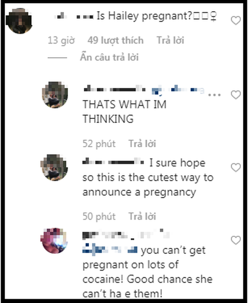 Với loạt ảnh này, nhiều người suy đoán rằng Justin Bieber có vẻ như đang rất hạnh phúc vì chuẩn bị làm cha và Hailey Baldwin đã mang thai đứa con đầu lòng. Người hâm mộ để lại nhiều bình luận hỏi Justin Bieber về việc liệu rằng có phải anh chuẩn bị lên chức bố nhưng chưa được nam ca sĩ trả lời.