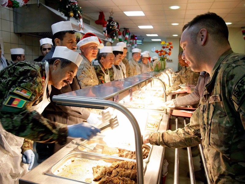Các sĩ quan cấp cao trong ngày này sẽ phân phát đồ ăn thức uống cho các binh sĩ. Trong hình là ác tướng Mỹ và Afghanistan phát bữa tối cho binh lính tại thủ đô Kabul, Afghanistan vào ngày 25/12/2012. |