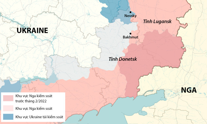 Quân đội Ukraine nhận định thành phố Bakhmut thuộc tỉnh Donetsk có thể sớm thất thủ. Tại những nơi khác, lực lượng Nga điều các đơn vị quy mô nhỏ tiến công thăm dò để tìm điểm yếu trong tuyến phòng thủ của quân đội Ukraine.