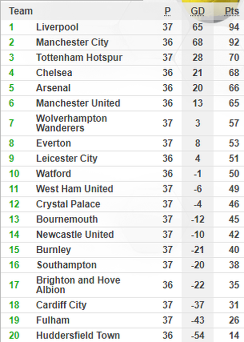Như vậy, sau 37 vòng đấu, Premier League chưa xác định được nhà vô địch và 4 tấm vé đự Champions League mùa sau. Nhưng đến thời điểm này đã xác định được 3 đội phải xuống chơi ở giải Hạng nhất là Cardiff City, Fulham và Hudderfield Town.