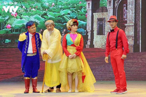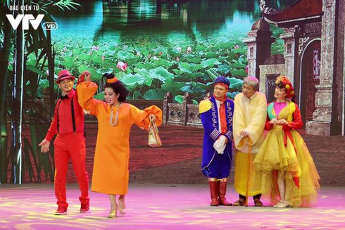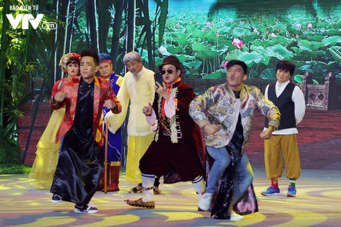 Về nội dung, chương trình vẫn mang màu sắc chủ đạo là hài kịch, đồng thời lồng ghép những câu chuyện, những vấn đề của xã hội trong năm qua như “Táo quân”.(Ảnh: Điện tử VTV)