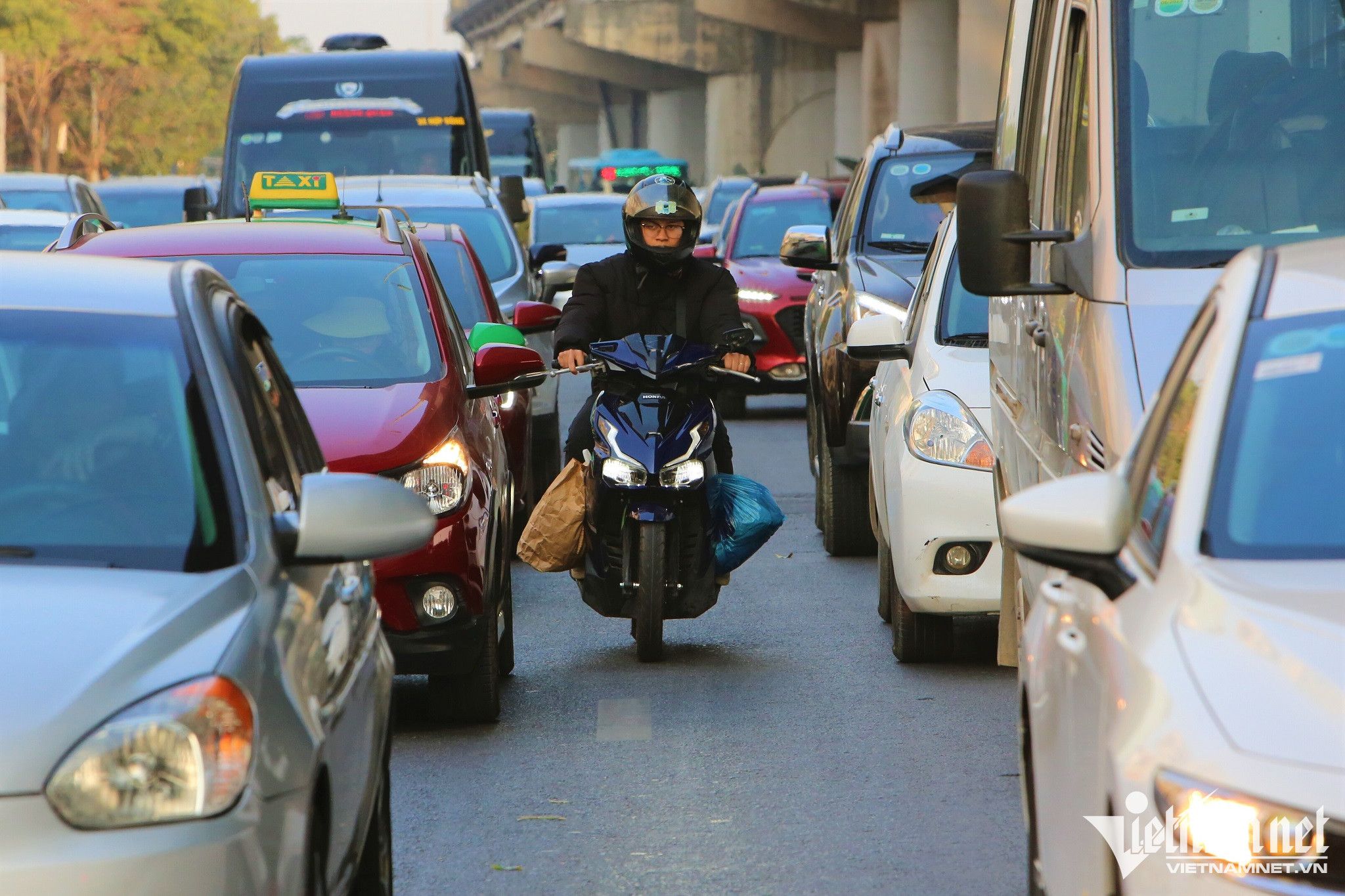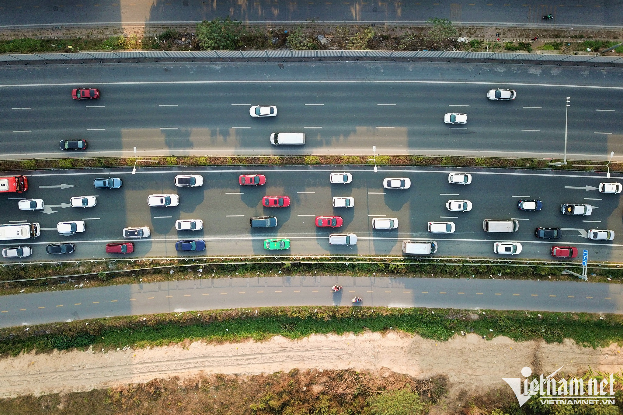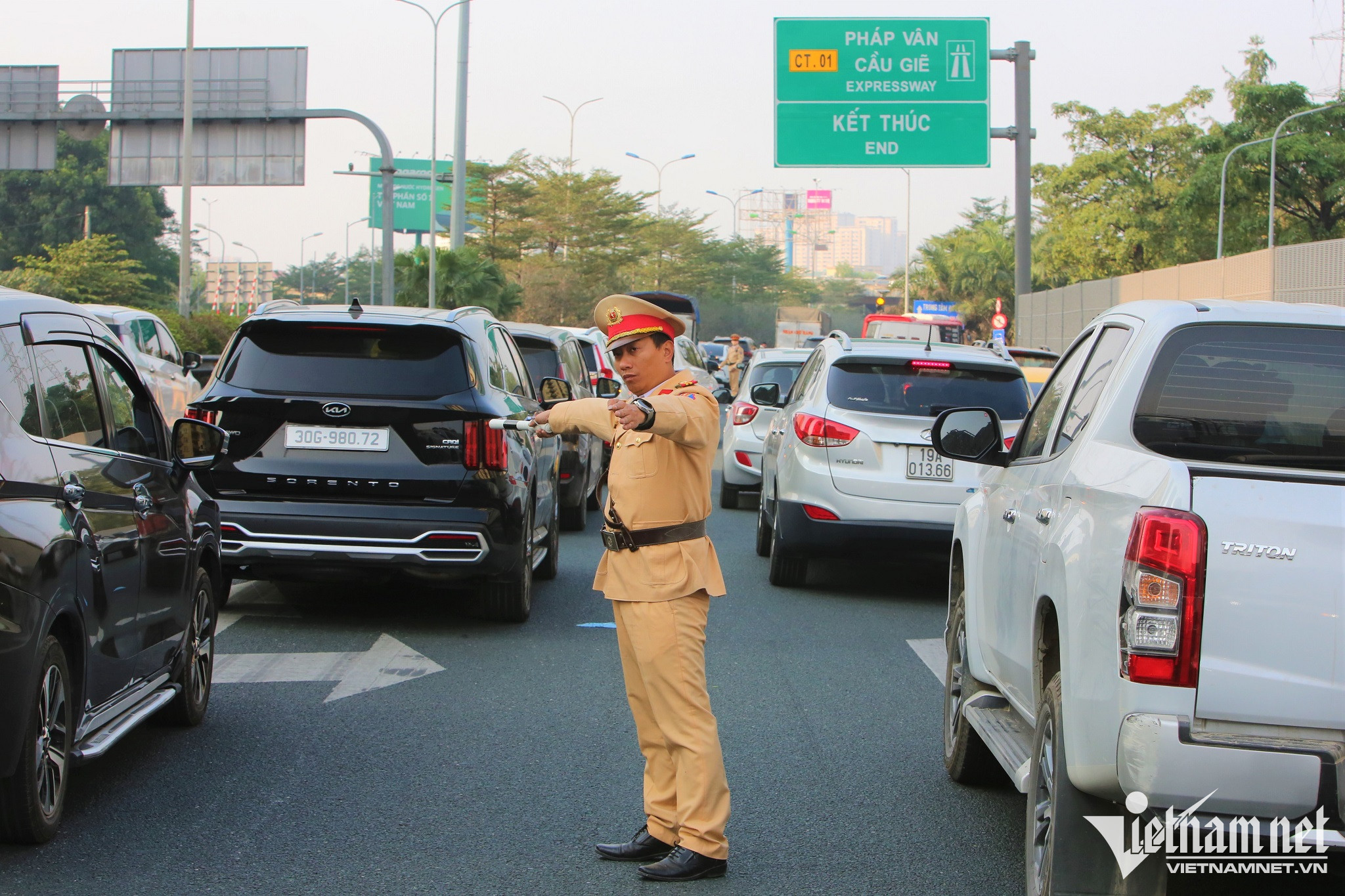 Lượng phương tiện bị dồn cục bộ kéo dài gần 1km tại cuối đường cao tốc để lên đường Vành đai 3 trên cao và vào trung tâm TP Hà Nội. Lực lượng chức năng gồm CSGT và Thanh tra giao thông đã dựng dải phân cách mềm phân luồng từ xa, giảm xung đột giao thông tại đây.