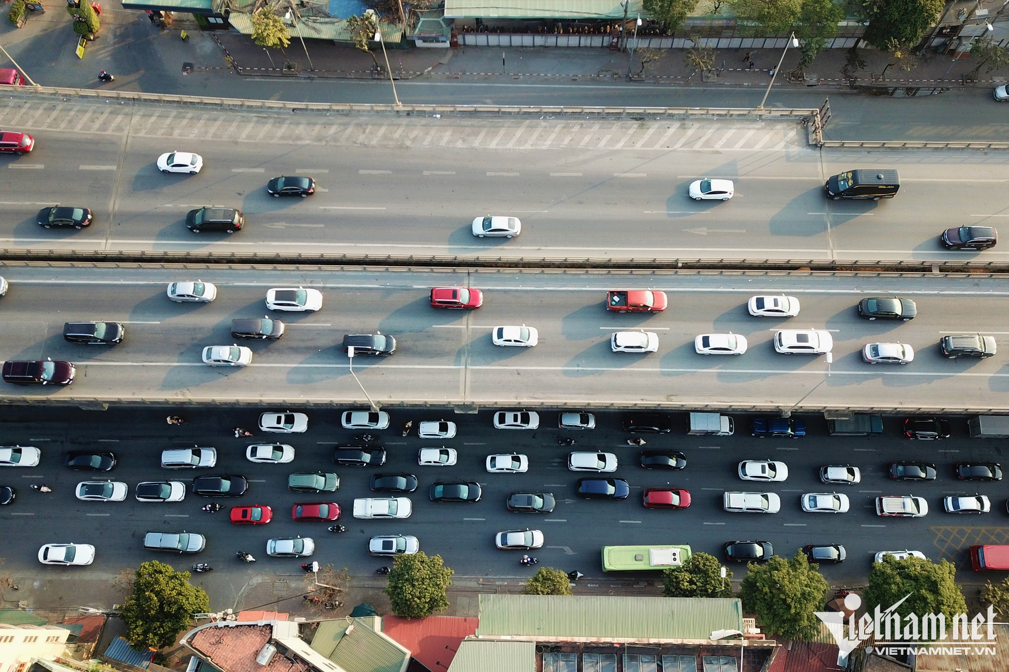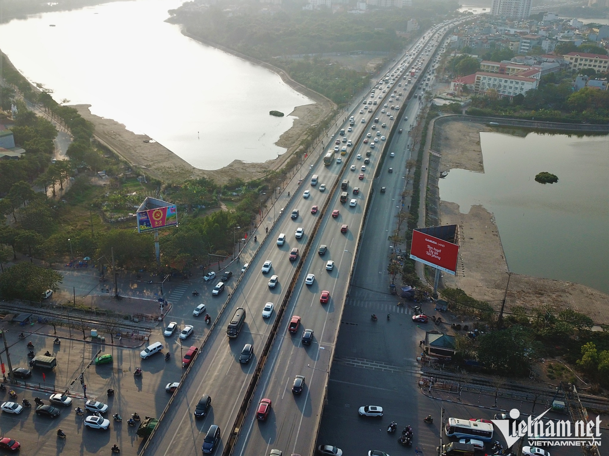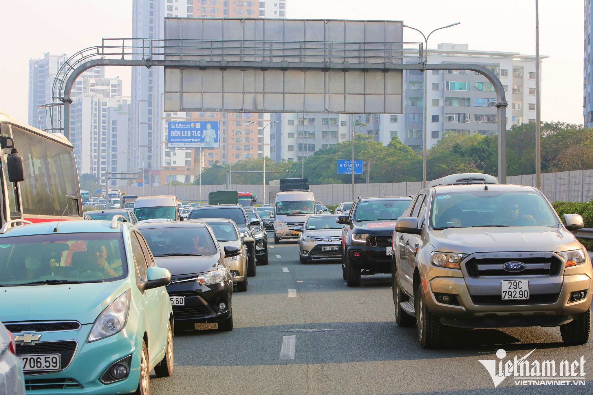 Lượng phương tiện bị dồn cục bộ kéo dài gần 1km tại cuối đường cao tốc để lên đường Vành đai 3 trên cao và vào trung tâm TP Hà Nội. Lực lượng chức năng gồm CSGT và Thanh tra giao thông đã dựng dải phân cách mềm phân luồng từ xa, giảm xung đột giao thông tại đây.