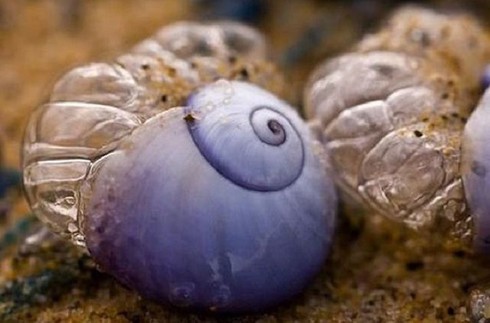 Do không biết bơi, ốc sên tím Janthina janthina có thể tiết ra nhiều lớp bong bóng nhầy giúp chúng treo ngược và trôi nổi trong đại dương theo các con sóng biển. Ảnh: blogspot. |