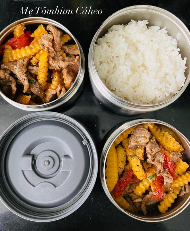 Với những món có cả thịt và rau củ như mướp đắng dồn thịt hay thịt bò xào khoai tây, chị Trân chỉ làm một món nhưng cho vào 2 hộp