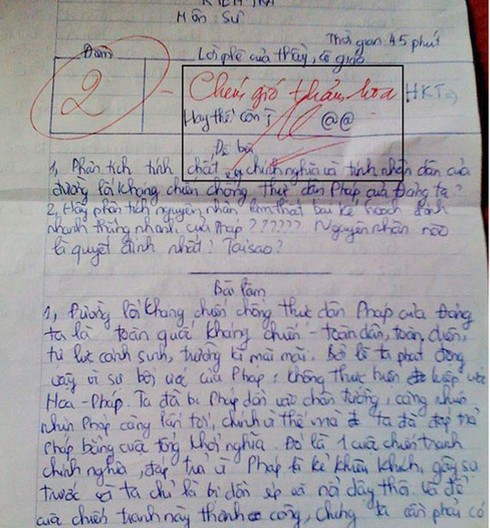 Một lời phê khác trong bài kiểm tra Lịch sử khiến người xem bật cười: "Trình bày bẩn, cẩu thả. Xem lại ý thức học ngay nếu thực sự muốn làm con rể của cô".