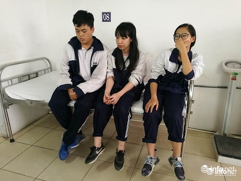 Ba em học sinh đang chờ kết quả tại Bệnh viện Thanh Nhàn. |